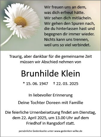 wir wünschen Ihnen von Herzen viel Kraft, dass Sie Menschen um sich haben, die Ihnen in dieser schweren Zeit beistehen und Halt geben. Zusätzlich können Sie auf dieser Gedenkseite Erinnerungen teilen und so das Andenken gemeinsam wachhalten.