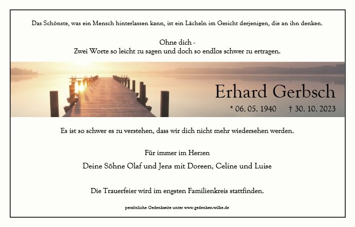 Lieber Papa, herzlichen Glückwunsch zum Geburtstag und alles Gute, wo auch immer Du jetzt bist. Wir vermissen Euch so sehr und hoffen das Ihr eine gute Zeit habt. Genießt Dein Ehrentag und lass Dich von der Mama schön verwöhnen 😊.