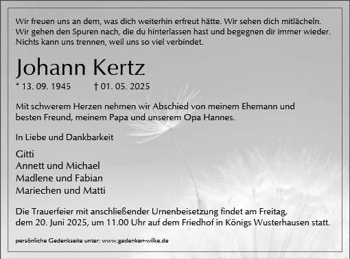 Johann, du warst ein guter Schwiegervater und ich bin dankbar, dass Du mich in Eure Familie aufgenommen und mir Deine älteste Tochter anvertraut hast. Ich habe es gemocht, wenn wir zusammengekommen sind, als Familie, aber auch wenn wir zusammen, was auch immer, gewerkelt haben. Wie Du mit unserer Tochter umgegangen bist, war einzigartig, Du warst der perfekte Großvater. Das hier ist nicht das letzte Wort, innerlich werde ich immer mal zu Dir sprechen