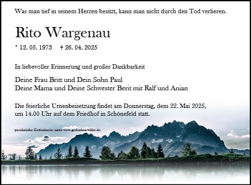 Hallo Rito, leider verloren wir vor Jahren den Kontakt und so erfuhr ich erst vor kurzem von Deinem Schicksal. Ich war und bin geschockt und muss oft an Dich denken. Mein Mitgefühl gilt Deinen engsten Angehörigen Britt, Paul und Berit. In stiller Trauer sende ich einen letzten Gruß
